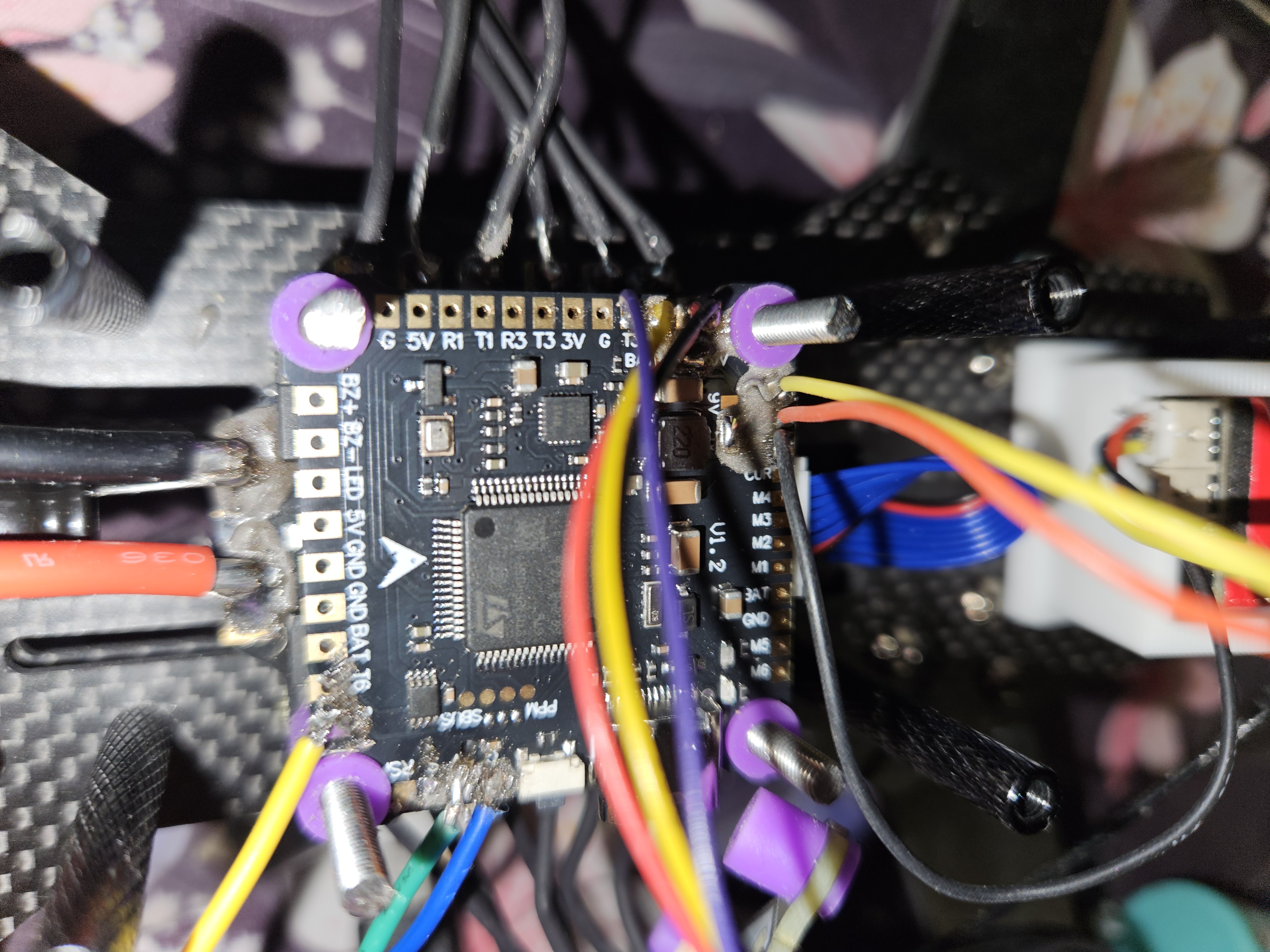 After building the farme we are putting 4 long m3 screws through the frame. Here we can mount the ESC and connect the motors. The motors are 3 phase synchronous motors. Solder the wires in groups of 3 no matter the order. The rotation of the motors can be reversed in post using the software. We are just soldering the 12 motor wires total to the ESC.Flight Controller